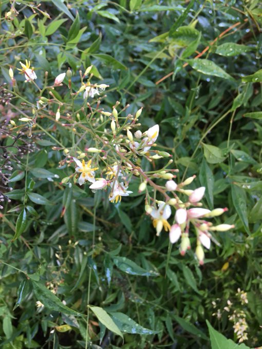【今日の季語3827<905】南天の花(なんてんのはな):仲夏の植物季語で「花南天」とも。当季に白い円錐状の花を付ける。原産地中国では赤い実を灯火に擬えて「南天燭」と呼び、葉が竹に似ることから「南天竹」とも称したのが和名に。◆南天の花のひそかに盛りなり(藤松遊子)