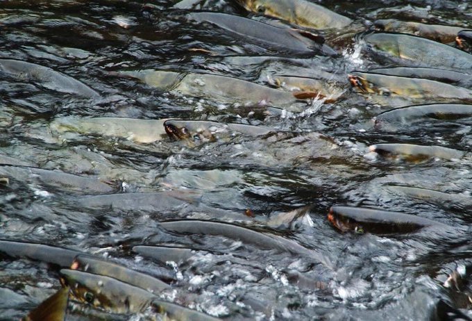 【今日の季語3915<993】鮭(さけ・しゃけ):仲秋の生類季語で「秋味」などの傍題も。海洋を回遊していた鮭はこの時季産卵のために故郷の川に戻って遡上を始める。食用に加工した「新巻」「塩引」などは三冬の生活季語。◆鮭のぼる肉の襤褸のあかあかと(小檜山繁子)