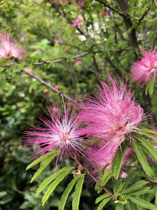 【今日の季語4166<1313】合歓の花(ねむのはな):晩夏の植物季語で「花合歓」などの傍題も。細い管状の雄蘂が刷毛先のように並んで咲く。「合歓」の表記は夜に葉の合する様を《歓びが合わさる》姿と捉えて婚姻にたとえた漢名に由来する。◆ほほゑみといふしづけさに合歓の花(坂本宮尾)